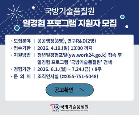 국방기술품질원의모든 소식과 이야기를미디어룸에서 만나보세요!