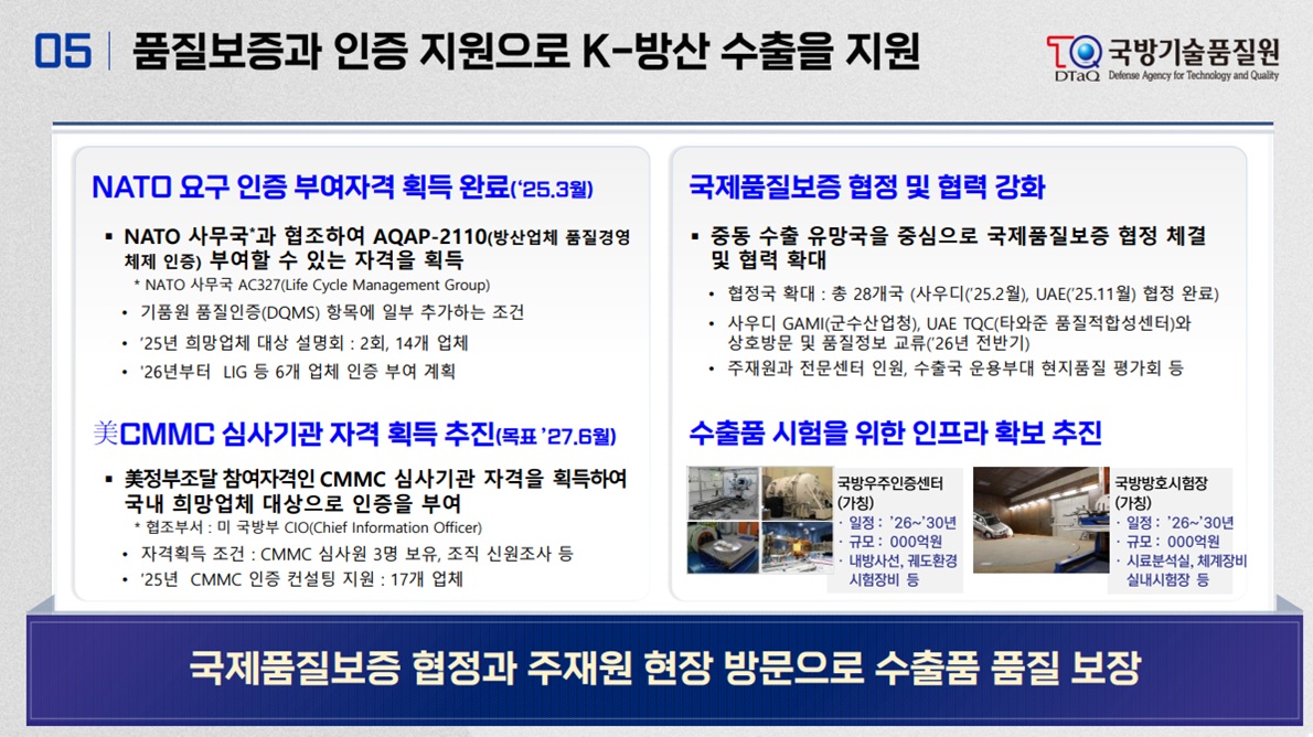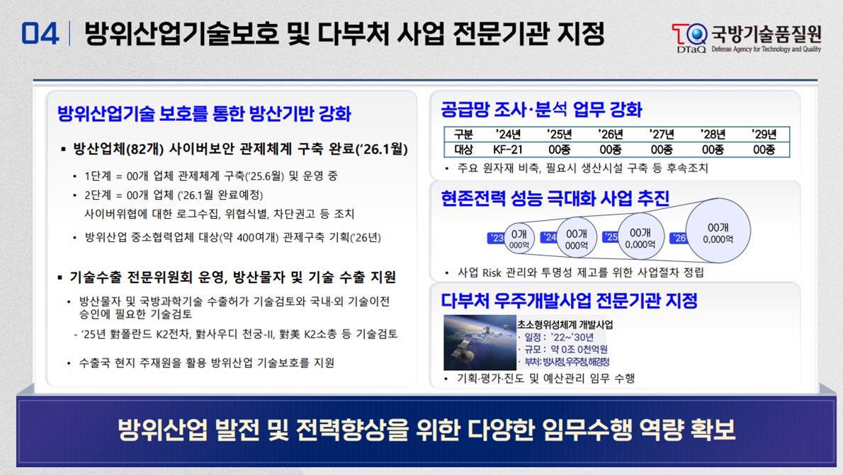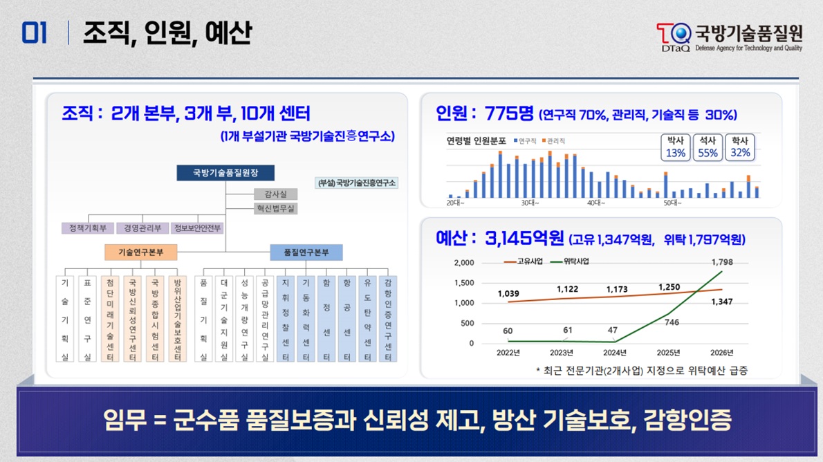 '2026년 국방부 외청 및 공공기관 업무보고'(2026.1.14.) 에서 발표된 국방기술품질원 업무보고 자료입니다.
